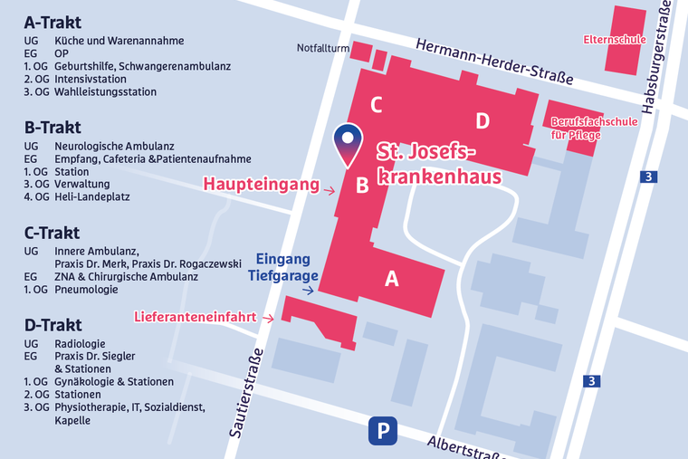 Sie erreichen das St. Josefskrankenhaus unter der Adresse Sautierstraße 1 in 79104 Freiburg im Breisgau. Direkt neben dem Haupteingang finden Sie die Zufahrt zu unserer Tiefgarage, wo Ihnen Parkplätze zur Verfügung stehen. Die Gebühren je angefangene 30 Minuten betragen 1,50 Euro, höchstens jedoch 20 Euro je Kalendertag. Weitere Parkmöglichkeiten bestehen in den öffentlichen Parkhäusern im Umfeld des St. Josefskrankenhauses.