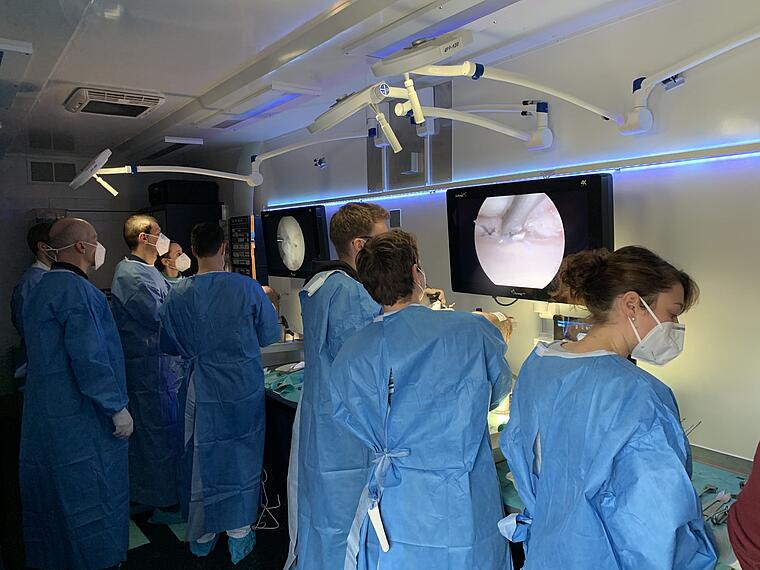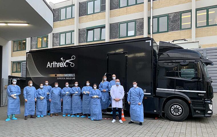 Vom 05.11.-06.11.2020 stand der Truck im Hof des St. Josefskrankenhaus und lockte einige interessierte Kollegen aus dem St. Josefs- und dem Loretto-Krankenhaus an. An zwei arthroskopischen Arbeitsplätzen konnten die Kolleginnen und Kollegen modernste Techniken in der Versorgung von Knie, Schulter und Handverletzungen an Präparaten trainieren.
